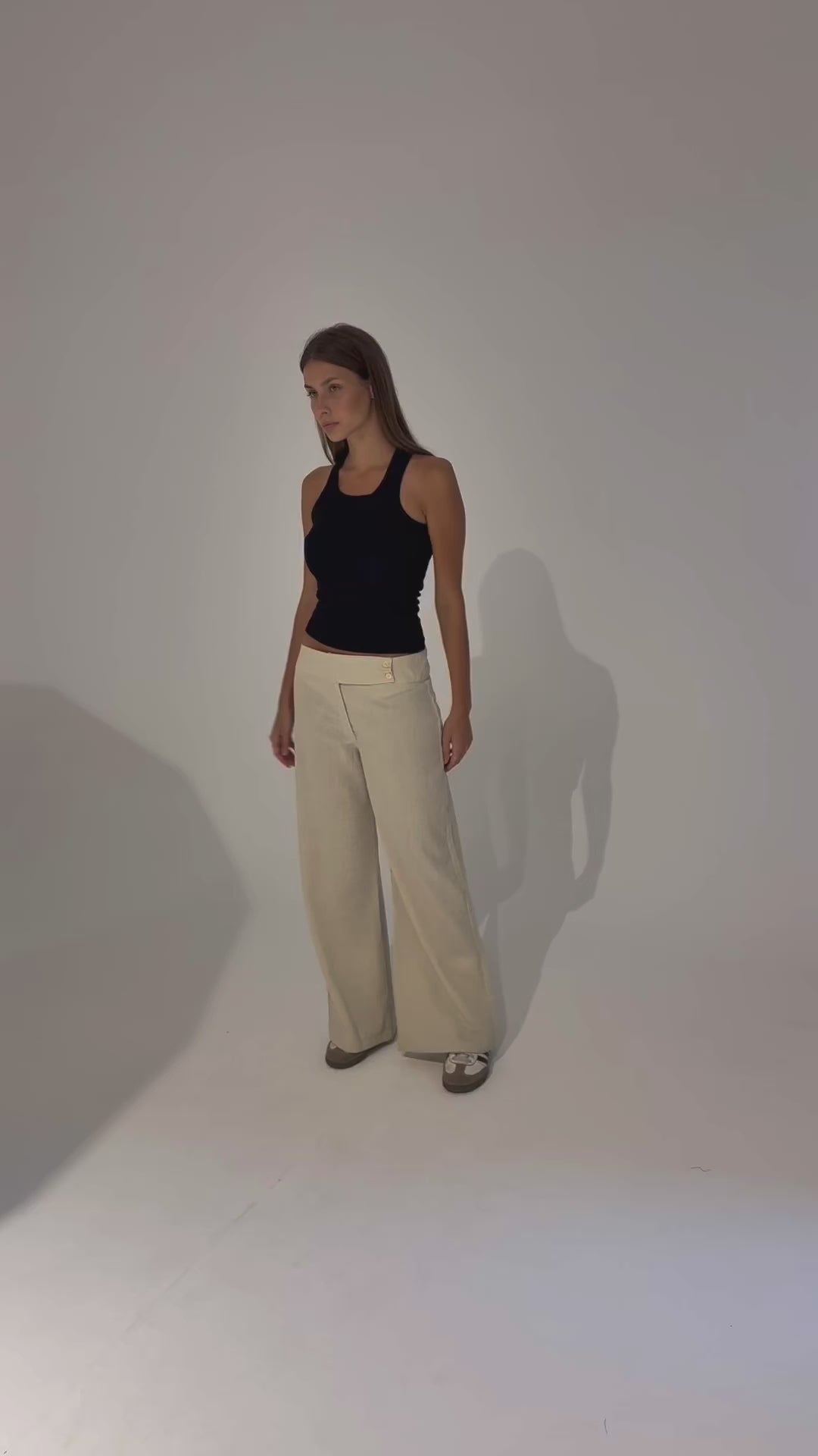 Breezy linen pants with two side buttons. Relaxed look. Model is size Small and wearing S.