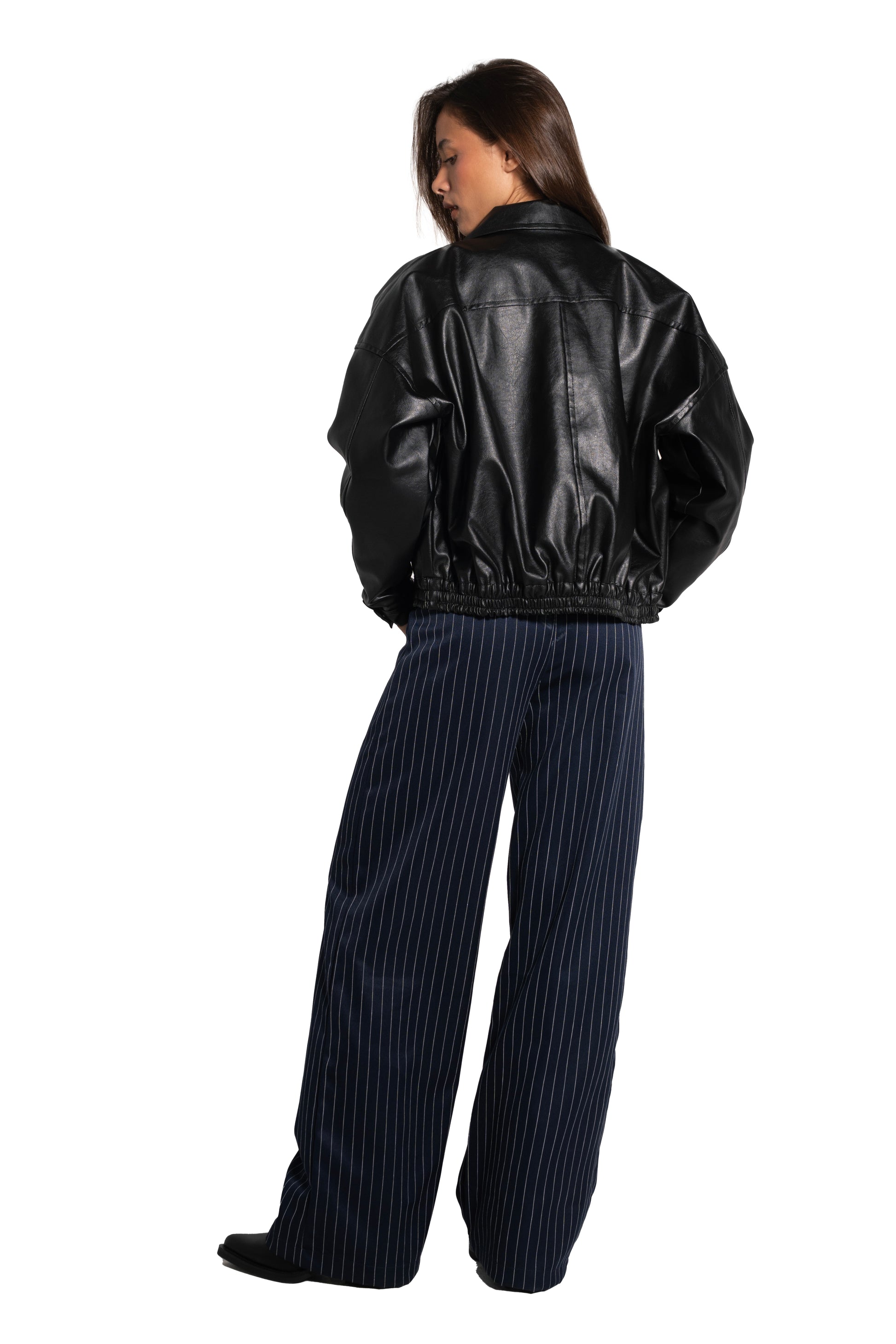 Striped wide-leg trousers with a straight waistband and double-button detail. Comfortable and suitable for everyday or formal wear.