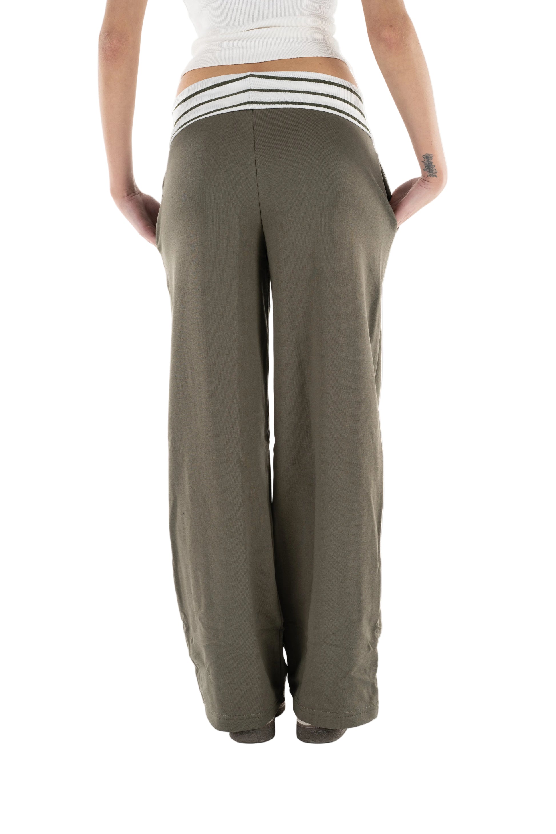 wide-leg olive sweatpants featuring a white ribbed waistband with olive stripes.